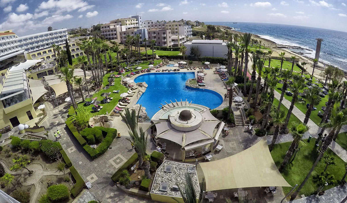 Directly on the beach of Chlorakas, Pafos, the hotels are by car drive only 5 minutes from the picturesque harbour of Pafos and 20 minutes from the airport.